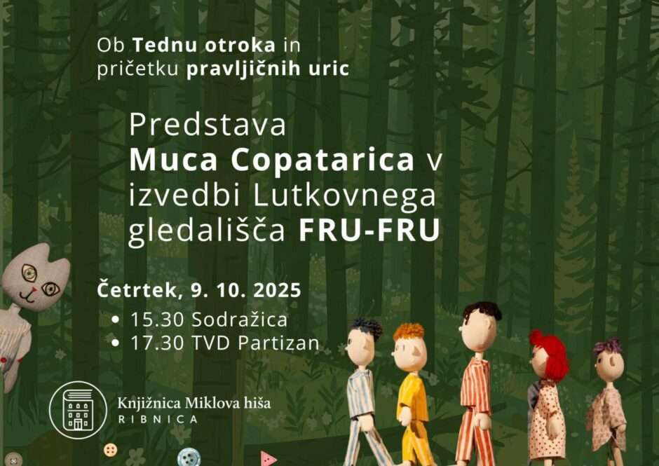 Ob Tednu otroka in pričetku pravljičnih uric naše najmlajše in njihove starše prijazno vabimo na prestavo Muca copatarica v izvedbi Lutkovnega gledališča FRU-FRU.