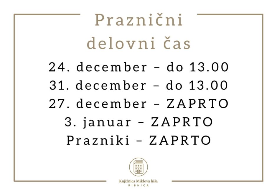 Stranke obveščamo, da bo Knjižnica Miklova hiša Ribnica v prazničnih dneh delovala po naslednjem urniku: